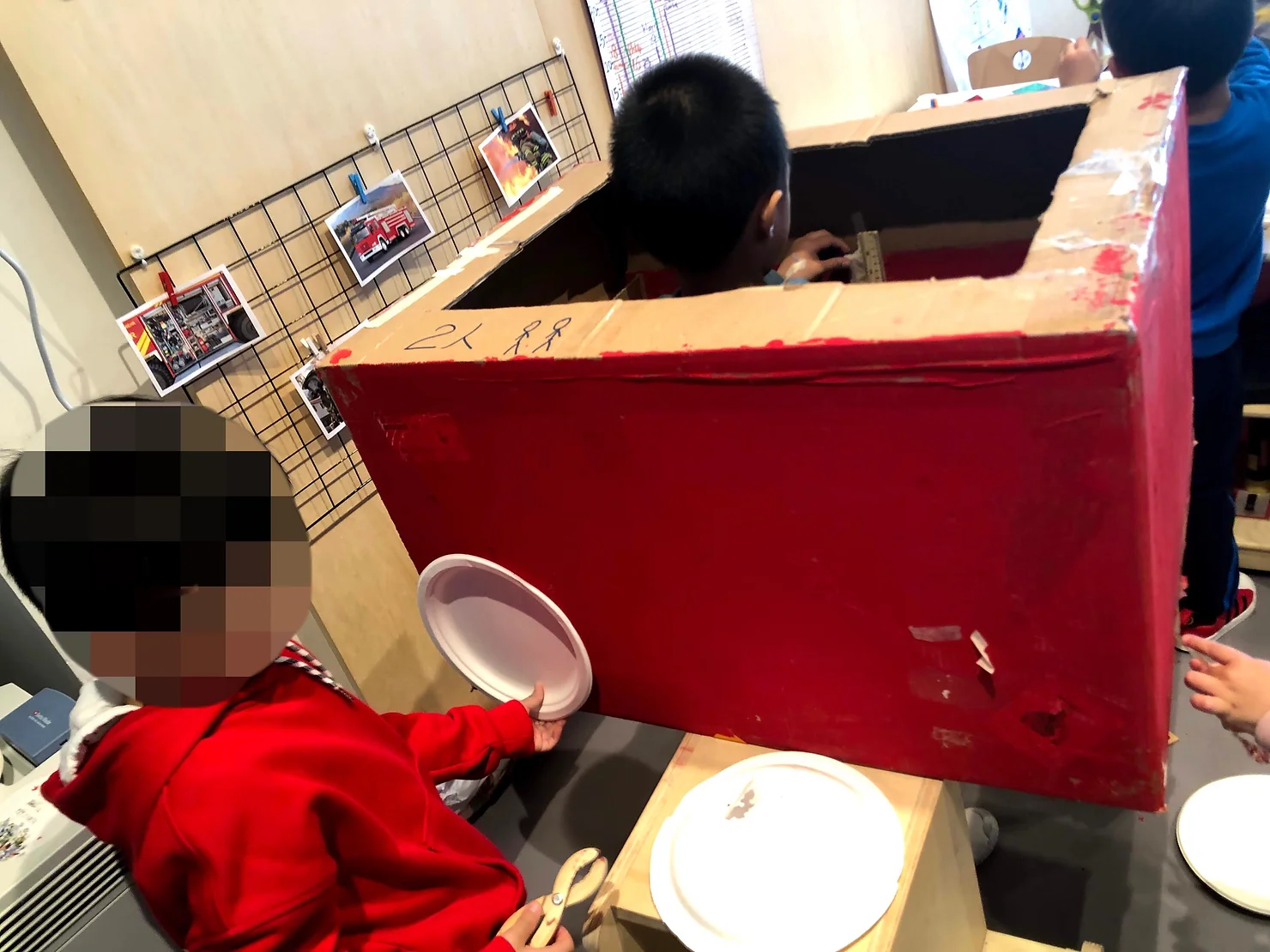 After a few days the box was completely red and the next steps were unclear. What would the students do next with this big red box? Luckily we had lots of loose parts in our classroom 'remida' (recycling area) and one student brought in a hose from his old washing machine at home. Some other children used four paper plates from the remida as the wheels. Using masking tape, clear tape, double sided tape and glue they added each item to the fire truck including the two water hoses.